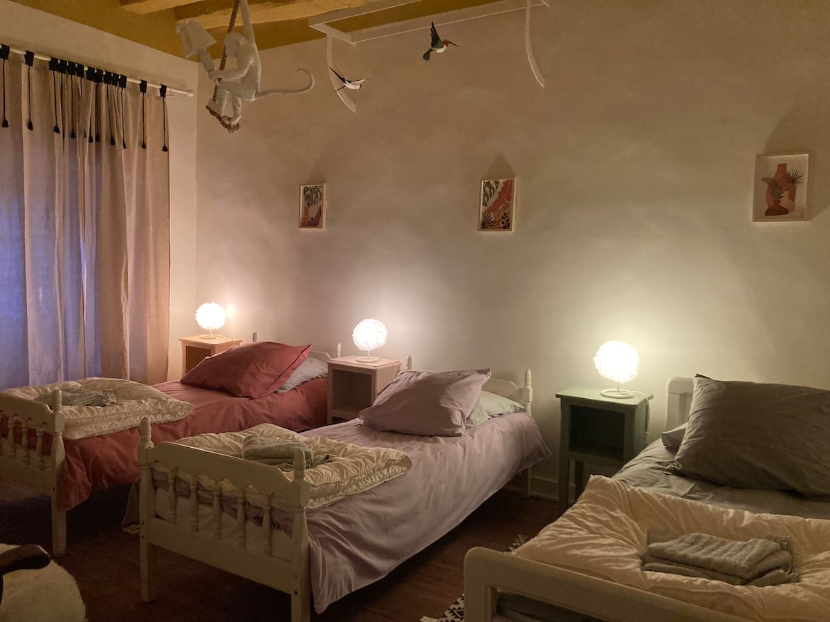 1 Chambre avec 3 lits 1 personne : 1 en 90 et 2 en 80.